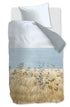 Die Bettwäsche Dunes präsentiert sich mit einer sommerlichen Meereslandschaft. Im Vordergrund sind Dünen mit Dünengräsern und Blumen in Natur- und Grautönen abgebildet. Im Hintergrund sieht man den Strand, das Meer und einen leicht bewölkten Himmel. Die Rückseite des Bettbezugs ist einfarbig in Blaugrau gehalten.
